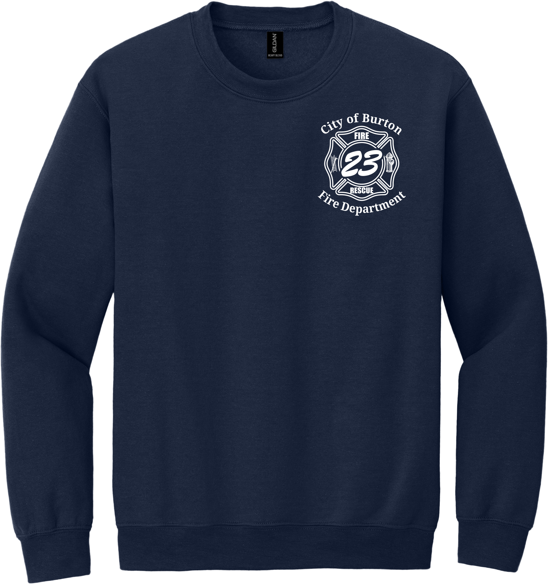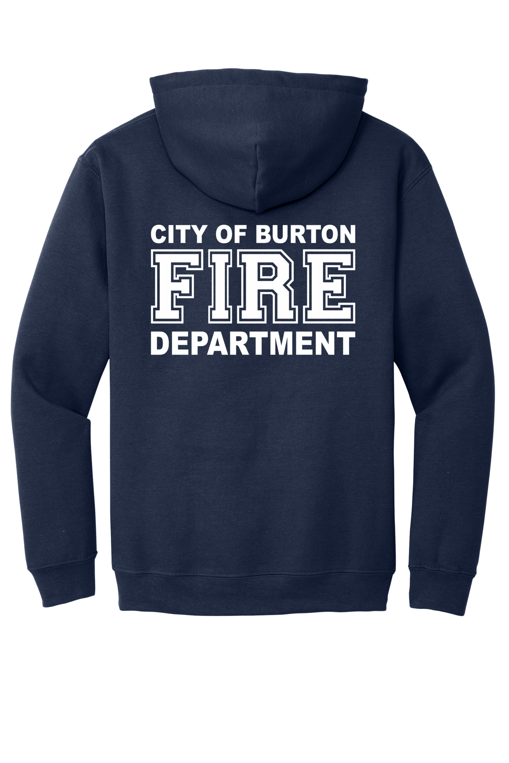 Burton Fire 23 Maltese Cross placed on left chest. Burton Fire Department printed on back.