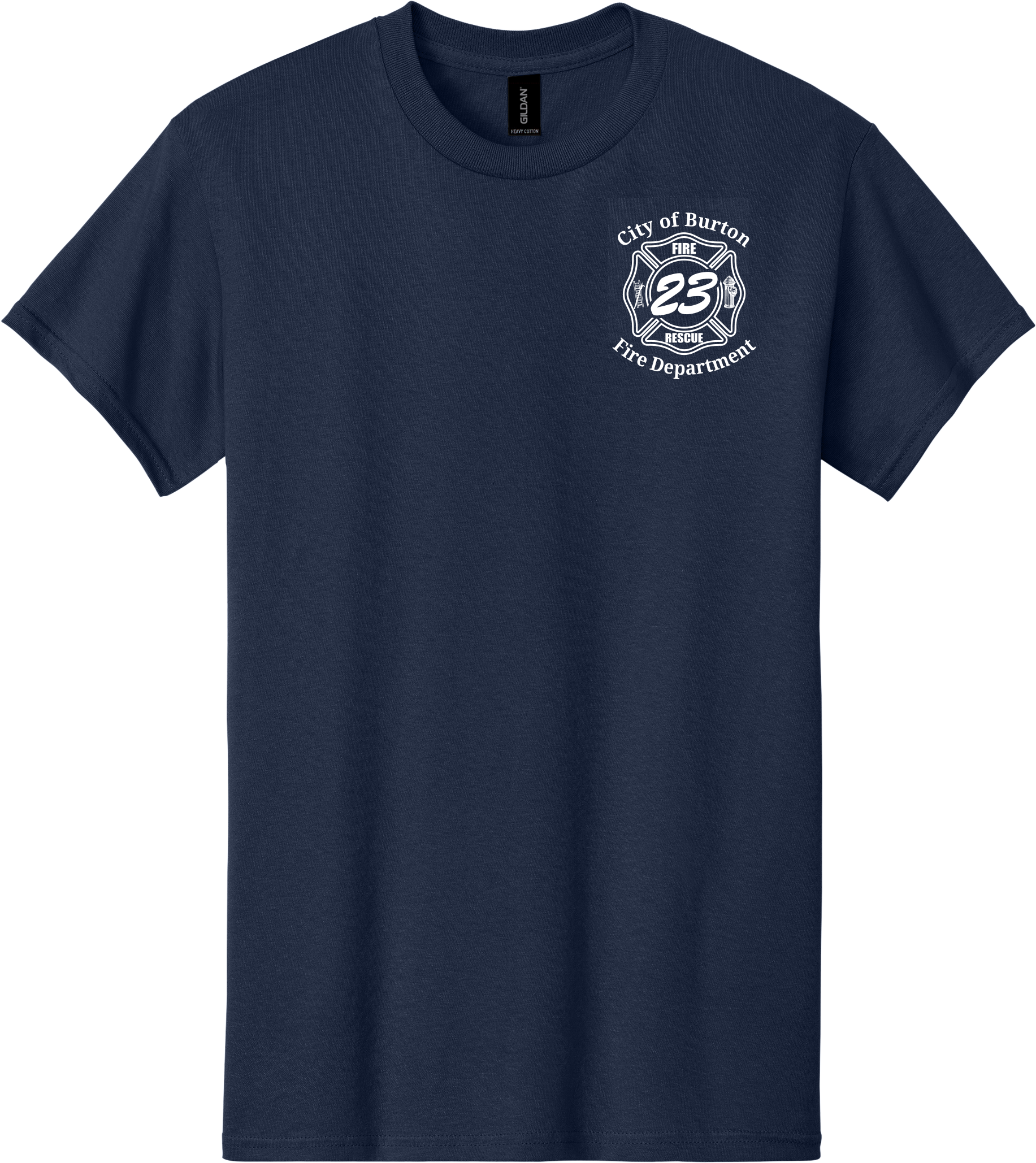 Burton Fire 23 Maltese Cross placed on left chest. Burton Fire Department printed on back.
